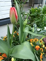 🏡では3色植えてて、遅れて伸びた子が追いつこうと必死な感じが可愛いです。蕾の色がほんのりわかるようになってきました。 たのしみです。🔴⚪️🟡揃わないと チューリップ🌷の歌🎶🎶にならないので頑張って欲しいです。 🙇