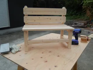 孫のベンチ製作しました 孫が食事やお絵描きする時のベンチを作ってみました。初めてのDIY作品です。この後にニスで仕上げしました。初めてにしては上出来かと自己満足です。
