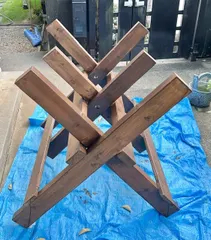 玉切り馬作り③ 玉切り馬作ってます。https://diy-square.cainz.com/announcements/8nlj2lbtc40ugnbj今日は塗装します。ストッパーと1番向こう側の脚だけ色が違うのは家にあった2×4使ったせいなんですけど、木材ってこんなに色変わるんだ!っていう見本みたいになってる。