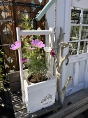 トールハンドルボックス コスモスを植えた鉢を入れました✨😉🎶めっちゃ可愛い〜😍💕季節の花は良いですね🙆♀️ 塗装:超撥水ペイント(ホワイト)ステンシル:エクステリアカラー(ショコラブラウン)