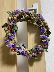 ランク5達成の記念に 家で育てたニゲラを使ったリースを投稿させて頂きます☺️ 春に種をまき、色とりどりの花を楽しみ種の袋の膨らんだ物をドライフラワーにしました 他の花も 花屋さんで買った生花をドライフラワーに(といっても ひもでくくって 干しただけ😅)リースの土台だけはダ○ソーで購入玄関の