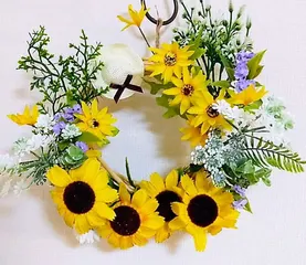 向日葵のリース🌻 wsで、向日葵のリース🌻を作りました💞向日葵🌻のfakeflourです🌟茎をリースに巻きつける作業で、針金なので花🌻の向きも自由に動かす事ができて、楽しかったー🥰木のリースが硬くてなかなか広がらないのが、唯一苦労した事でしょうか🌟✨