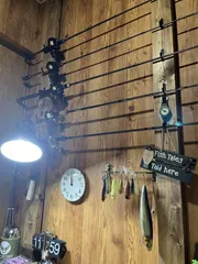 趣味部屋大改造その2 カウンターから天井に、リマルテで2×4材を突っ張らせて、釣竿を掛けてみました。以前は市販のロッドホルダーを使用していましたが、あるインスタグラマーさんのお部屋が素晴らしくカッコよかったので、参考にさせていただきました。 カウンターの奥は豪華に飾る予定でしたが、収納スペースが足らないので、そ