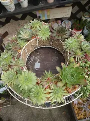 センペルビウム こちらの投稿に刺激を受けてセンペルビウムのリース寄せ作って見ました😊リース台はカインズさんで購入。この間作ったカウンターチェアにピッタリでした😍グリーンネックレスたらり〜ん