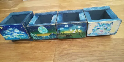 マス鉢 寄せ植え用にマス鉢を4つ作りました絵は自分で描きました🎨 底穴は私が作ったトレードマークのネコの形にカットしてあります 今回は植え口を斜めにカットしたけど、上手くいくのかは植えてみないとわかりません🤭