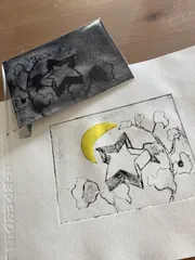 初 ペーパードライポイントっていう版画を体験してきました。厚紙に、絵を描いてカッターナイフで傷つけて、色紙も月の形で貼ってみました!楽しかった〜。一週間くらい乾かしてから、額に入れ飾ってみます。