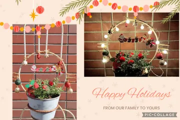 ヒイラギでクリスマスデコレーション🎅 ■作品内容ヒイラギの苗を植えて、クリスマスデコレーションしました🎁苗にもともとシルバーのラメと丸いポンポンが付いていたので、サンタと雪だるまのピックを付け足したり、うさぎ型のスタンドにオーナメントをくっつけて、後からライト💡を追加しクリスマス感を演出しました♪夜でもライトアップで楽しめて、家族の帰り