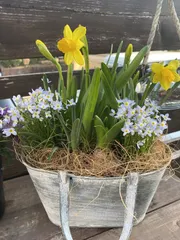 GWS春を待つ芽出し球根のアンティーク寄せ植え GWS参加してきました😊ヒヤシンスとムスカリは開花がまだ先になりそうです🪻ひなそうとスイセンだけでもかわいい💕球根たちの成長が楽しみです✨