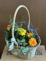 可愛いかごの寄せ植え 名古屋みなと店にて作成 マリーゴールド スクテラリア(ブルーファイア) 羽衣ジャスミン(ミルキーウェイ) グレゴマバリエガーター を 可愛いかごの中にバランス良く植え込み グレゴマを2個に分けて入れ込むときに力が入りすぎク