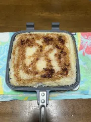 キャンプ飯にいかがですか 昨晩は気温も上がっていたのですが妻から晩御飯はもやしが悪くなっちゃうから「もやし鍋でいいよね」と言われました。反対などできません。ならばと私は残りご飯でかねてからやりたかったホットサンドメーカーで焼きおにぎりを作ってみました。■材料 残りご飯茶碗2杯分 醤油 化学調味料■作り方前日の残りご飯を使い