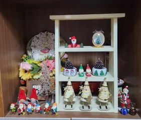 ■作品内容昨日WSで作ったカフェ風ショーケースにクリスマス雑貨と先日作ったツリーを入れてクリスマスを演出しました🎄 ■工夫ポイント中はもちろん上にもサンタさん🎅玄関が一気にクリスマスです🎄.*🎁🎅🌟