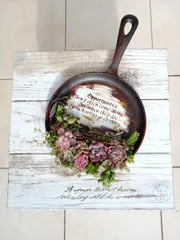 ダイソーのスキレットに多肉寄植え ※キャンペーン用に再投稿になります。■作品内容ダイソーで買ってきた300円のスキレットをアンティーク調に加工して、多肉を寄植えしてみました。 ■こだわりポイント壁掛けにできるよう、ネルソルを使用して多肉を寄植えしたこと。錆び加工をアクリル絵の具で施したこと。