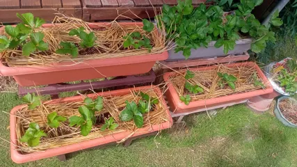 いちごの苗を植えました🍓 ■作品内容去年から育て始めたいちご🍓そのランナーから孫株を育て、新しいプランターに植え付けました🌿■こだわりポイント去年はいちご用の培養土を買いましたがお値段が高いので、こちらの2種類の土を混ぜて使用してみました☺️かる~い培養土はプランターを移動させるのに良さそうです😊作業中暑くなってきたので藁の