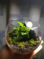 お月見 (テラリウム) 苔とシダのテラリウムです秋なので十五夜がテーマです。岩山からお月様が覗いています🌝緑が映えるよう黒い富士砂を敷きましたこだまの後頭部がお月様代わりです暗くなるとちょっと光ります✨