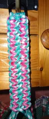 その22は 細い編み方でしたが、23 は ワイドです。巾4cmのコブラベルトです。 コブラとコブラ2本並べて合体した物です。その22で苦戦している方が多い?。23を前倒しで載せてみました。 今度は 簡単 ですよ。 ウエストベルト用のバックルに 直接編み込むと 大型ワン公