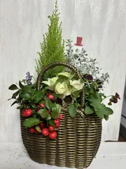 バック型クリスマスの寄せ植え🎄 GWSへ参加🪴葉牡丹一つとビオラ(オシャレビオラ ジョイ)を2つ選び、チェッカーベリー、ゴールドクレスト、オレアリアリトルスモーキー がセットされてた‼️6株です!この小さなカゴ🧺に入るのかしらと❓❓適正に応じて 土を除いて 順に🎶🌱先生のお言葉どうりに植え込んでいくなんと‼️6株がカゴ🧺の中で 仲