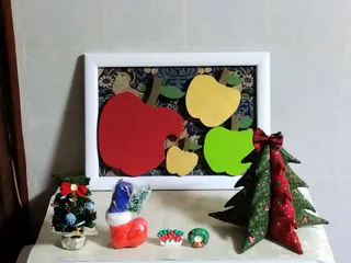 糸鋸で作ったりんごのオブジェとクリスマスディスプレイ