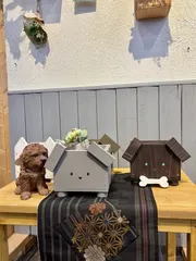 アニマル鉢カバー アニマル鉢カバーを作ってきました🐕🦺 午前と午後に予約して、午前中に2つ作りました✨ 猫も可愛かったのですが、犬の鉢カバーにしました😊👀のバランスが、どこに描いたらかわいいのか悩みに悩んでブラックの犬の鼻が、下すぎてどうしても、口に見えてしまう🤣耳が、写真撮る時に動いてしまって