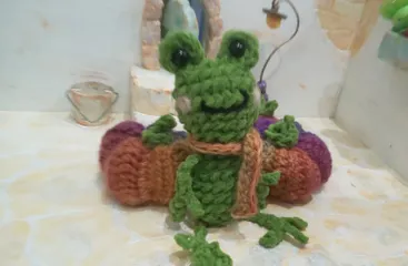 カエル(編みぐるみ) 私の編み物は目数を数えない、適当編み🤭この毛糸は、編み直しするとハゲてしまう毛糸🧶なんて相性悪いんでしょう⤵️😥 過去は振り返らない人に!!とアドバイスを頂いたので、何とか編み進めましたよ~~🤣 口とほっぺは羊毛フェルトでチクチクして、マフラーも編みました😆 カエル🐸ち