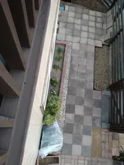 旦那さんと共同作業していた庭です。ここは化粧砂利を一面に敷いていたのですが薪棚に続く道なの歩きやすいように砂利をすべて撤去。コンクリート平板を敷き詰めました。ついでに植栽エリアを拡大したのでいずれ日陰向きの植物を植えたいなと思っています。とはいってもじつは完成形ではないのです。年内に完成させようと毎