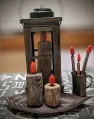 ロウソク風オブジェ 先日薪棚から持ってきて一生懸命皮はいでヤスリがけした木材。やっと形になりました😅やすったあとは形が良さそうな部分を切り出して適当な長さに。左からオールドウッドワックス、蜜蝋ワックス、無塗装の3種類を使って塗装。無塗装以外は少し汚しを入れました。頭に火の帽子被せたらそれっぽくなったかしら😅