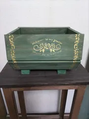 プランターカバー 今日はとっても良い天気でWS日和でした。思ったよりも早く作業が終わって塗料が乾くまで久しぶりに店内散策、4月予定の【どこでも駄菓子屋さん】の見本を見つけちゃいました。塗料は2年前にプライス価格で買ったアイビーグリーンを゙持込みで使用、帰宅してからステンシルしたのですが上手くいかず、最終的には手書きで