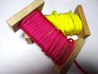 キ-ホルダ- 屋内作業が楽ですね。 パラコ-ド4mmです。 ↓ ライタ-で温め接着します。 ↓ 赤白コードは芯です。15cm程。 ↓ この編み方の繰り返しです。2色使いの方が解り易いです。