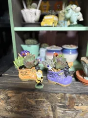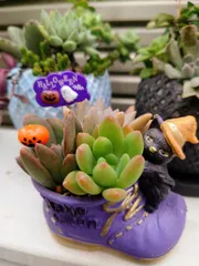 可愛い鉢に多肉😺 Greenワークショップで寄植えしてきました🥰オレンジと紫のブーツがありましたが紫を選びました🥰春萌、秋麗、レズリーの組み合わせ セリアでお弁当用のピックを購入良い感じ〜🎃🧙💕