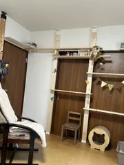 新入りさんのためのステップ ■作品内容・キャットステップ ■作品のこだわりポイント・新入りの猫のために新たにステップ。高いところが好きそうなので、天井近くにお昼寝できる場所、カーテンレールの上も歩けるようにしました。今後さらに伸ばして、本棚の上に降りたり、そこからソファー〜床に降りられるようにする予定です