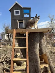 ■作品内容キャットタワーのお外バージョン ①庭のケヤキの木を伐採 切り株に穴を開けて祠風猫ハウスを作成。 ②切り株の上にスノコを設置。 ③ペットハウスを組み立ててスノコの上に設置群馬の強風で吹っ飛ばされないよう、ちゃんと固定 ④ハシゴを作