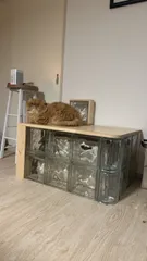 ■作品内容 キャットステップ兼飾り棚を作りました。 ■作品のこだわりポイントキャットボウルを取り付ける為に板壁を取り付けキャットステップも小さな物を飾れるように箱型にしてみました。