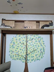 ココから眺めるのが好きだニャ ■作品内容 キャットウォークならぬキャット展望台 ■作品のこだわりポイント CAINZでピッタリの大きさにカットしてもらい、好きな飾りをつけました。下の障子には、襖紙を貼って、マスキングテープを小さく切って、ツリーの様に貼り付けました。