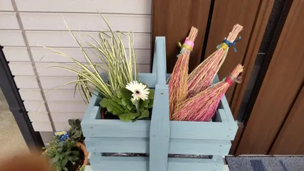 コキアで作るナチュラルほうき ミニサインボードに平行して コキアのほうきを作りました😉 コキアの束の種などをブラシで取り除きます少しずつ束ねますそれをまた まとめて 好きな長さにカットしてでき上がり💗 ひもで括るのは 不得意なので またやり直してみます👌引っかけるための輪っかも忘れまし