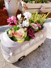 バスの植木鉢 可愛いですね🌸 見たことないです😅 白色の植木鉢にお花とミニベンチの 色合いがよくあいますね❣️