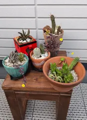 10月に植え替えをした多肉植物とサボテン。 ルビーネックレスの入った鉢にあまりに水を与えなかったためか少ししぼませてしまいました。反省して毎日様子を見てお手入れをしたら、先週黄色い花を付けてくれました。他のサボテンや多肉植物も元気に育ってくれています。 ミニベンチもCAINZで作った作品で