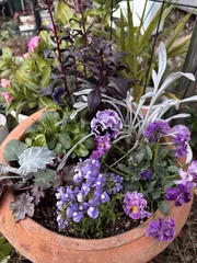 紫で寄せ植えしました💕10円ヒューケラ入れましたが小さめです。一緒に育ってくれるといいです😅