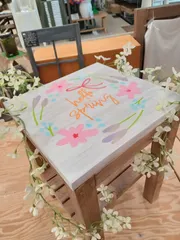 4/5日誕生日で春生まれで春はだいすき。花がたくさん咲くからいいよね…と言うことで4/3にシェルフスツールのワークショップに参加してきました!春の作品なので春色沢山使いました。混ぜて作った色も素敵ですよ…