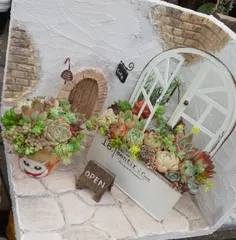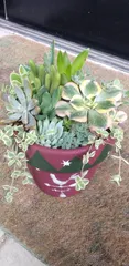 鉢の塗装と多肉寄せ植え 鉢の塗装、🔰、上手くいきませんでした😆先生、「塗料の色が暗くて大丈夫かな?と思ったけれど、多肉が明るくて良い感じ」と言ってくださりホッ💗ステンシルもいっぱ~い!! 楽しかったで~す😊