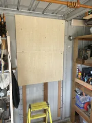 有孔ボードの取り付け 今日はこの場所に先日作成した有孔ボードを取り付けます。ごちゃごちゃしているのを先ずはお片付け(;^ω^)ネジを打つので柱を取り付けます。ガレージなのでもちろん後ろは鉄ですが、直接の取り付けは出来ないのでそこに土台となる柱を取り付けます。どのようにして取り付けるかかなり悩みましたが木材と鉄の板材で固定