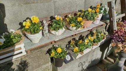 コンクリートブロックのすき間に花を 今日も寒いですね~🥶🥶🥶我が家でよく日が当たる場所はひと癖ふた癖あります。前回百均の板を使って、小さな鉢を並べましたが、実はもう1段下にもっと細い段があります。何で一緒にしてくれなかったのか?1段にしてくれてたらプランターも並べたのに😮💨😮💨😮💨外構工事のおじちゃんのみぞ知る〜〜〜😦😧😦😧今な