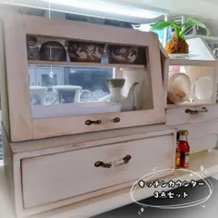 アレンジアワード2023【キッチンカウンター3点セット(ぜ~んぶリバーシブル🔄)】 *カフェ風ショーケース*一段引き出し*スパイスラック…の3点セットを、全体に同じ感じで汚しを入れて、キッチンカウンター用に前からも後ろからも使えるようにアレンジしてます☺️カフェ風ショーケースは、昨年のアワードにエントリーしましたが、https://diy-square.cainz.com/anno