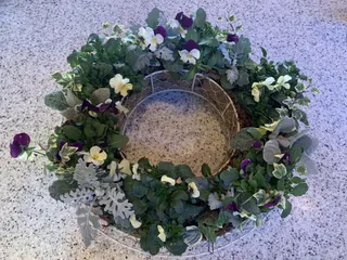 お教室前のテーブルに展示してあったリース型寄せ植えに一目惚れ⸌◦̈⃝⸍ 生憎、お教室の先生は不在スタッフさんに聞きながら自宅で見様見真似でꪔ̤̮