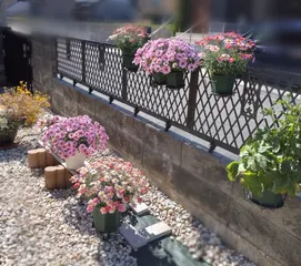 マーガレット そろそろ霜の心配なさそうなのでベランダから庭に出しました。柵にかかってるのは3月に娘宅に行くはずだったのですが工期が遅れて行き場がなくなっちゃいました。そんなわけで5号スリット鉢のままです💦 マーガレットが並んで可愛いけどおばちゃんちょっと照れるわ〜💦