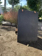 簡易廃材看板🔨 廃材で黒板になる板をゲットしたので、看板を作りました♪ 知り合いの方のお手伝いでマルシェに出店することがあるので、その際に使いたいと思います^ - ^ 上はドリルで穴を開けて、紐などを通して結びます。下の方に板をつけて重さを加え、チェーンで開く範囲を制限し、風や当たっても倒れないようにし