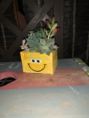 以前、産直のまほろばキッチンで買って来た寄せ植え 丁度黄色い鉢だったのでニコちゃんのリメイクしてみました 先日植え付けたゴムの木とオソロ ニコちゃんです❣️