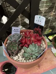 朝にホームセンターの多肉寄せ植えがあると教えてもらったので行っていました。😊 私の行った店舗では、LINE登録して1個プラスして4株選んで植えることができるとのことでした。 月の王子、メビナ、錦晃星、ピンクルビーを選んで植えました。欲しいのがあるならお得です。 小さい苗