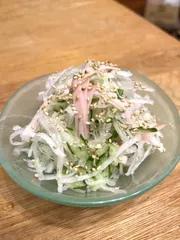 大根サラダ ■材料大根 1/4キュウリ 1本ハム 1P塩 少々 ■作り方①大根、キュウリをスライサーで千切りにして水にさらす。②しっかりと水分を絞って少量の塩を加えて揉んでおく。③パックごと、細く切ったハムと合わせて、炒りごまを振って出来上がり。最初に開けて、剥がしてから切るとパラパラになりやすいです