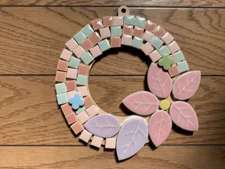 タイルのリース 外出した先にタイルのリース体験があったので参加してみました✨ 大きなお花と葉っぱのセット以外にも何種類かあってそこから一つ選び、周りは、好きなだけタイルを使っていいとのことでした。 毎回、思いますがデザインが決まるまでにかなりの時間がかかり決まれば作っていくのは早いなと思いました