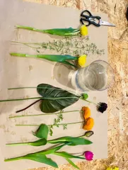 フラワーアレンジワークショップ ゲリュースと言う骨組みを使ってお花を束ねました✨ お花の本数が少なくても豪華に見えます♪ 最後にまた、くまさんを入れてみました😅今回の骨組みは先生が作ってくれたものから選びました✨