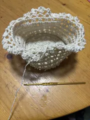 巾着なかなか進まずやっと形が見えてきましたが😱大変な間違いに気がつきました💦とりあえずこのまま進もうと思います🧶